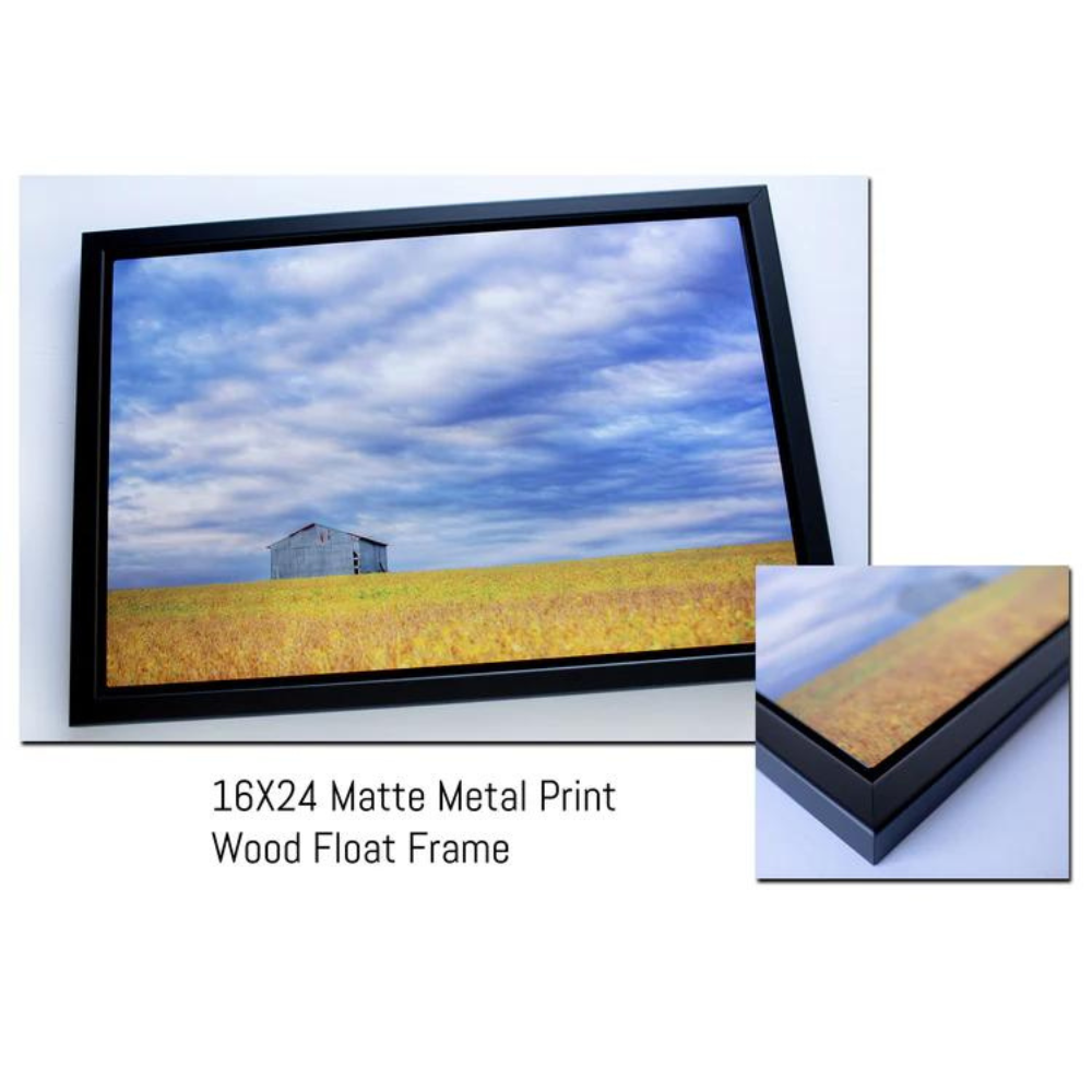 Metal Prints with Glare Free Matte Finish or Vivid Gloss Finish - Mounted in Black Wood Float Frame.