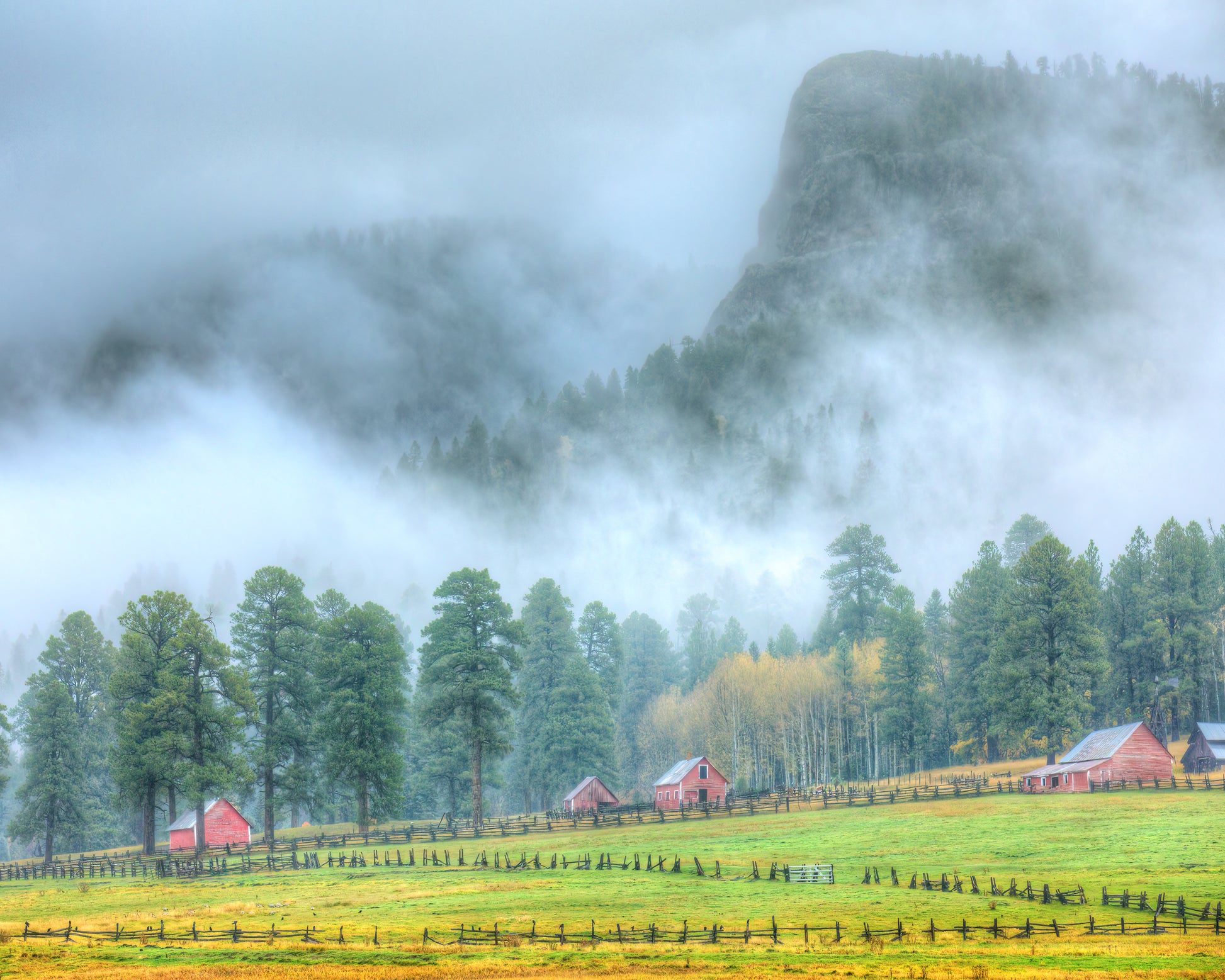 On a stormy morning in the San Juan Mountains, we drove to this location not sure what we would find. We had been shooting variations of this scene for several days and we saw the clouds had lowered into the hills so we had to go look. It was amazing. When printed large, you see so many cool details in the shot, like the little black birds on the fences. One of our favorite new images.