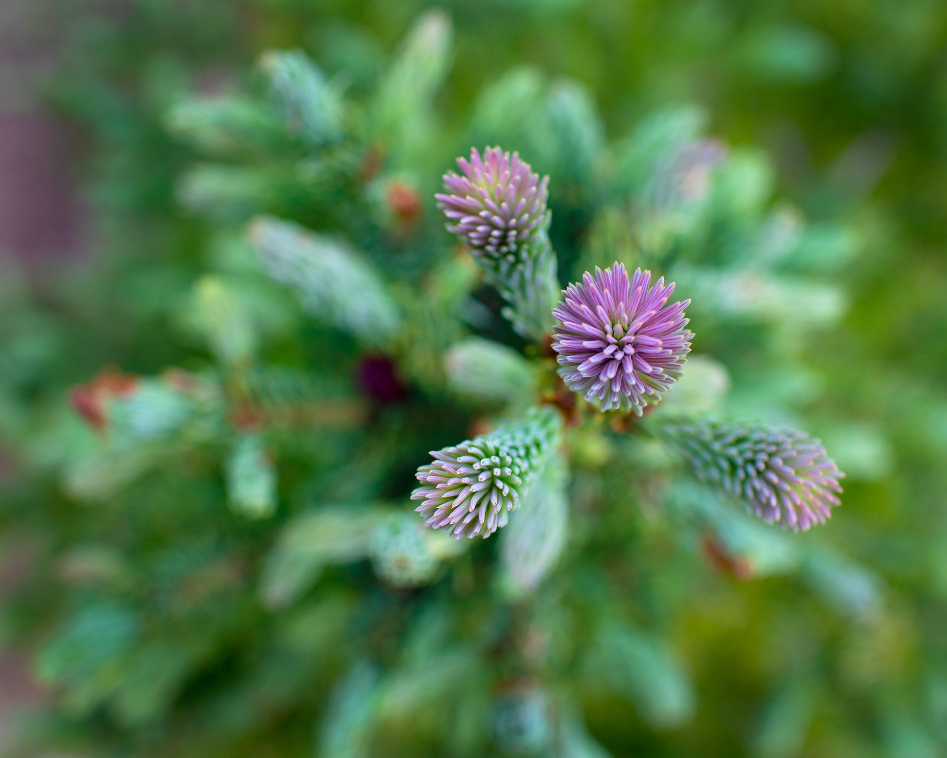 Sometimes when we take our trips to Colorado, Chris will break out her fly rod and do some fishing, while I wander around looking for interesting shots. It was during one of these times that I noticed these beautiful little purple buds at the top of some baby pine trees. This angle is looking straight down on top of the baby tree for a unique viewpoint.