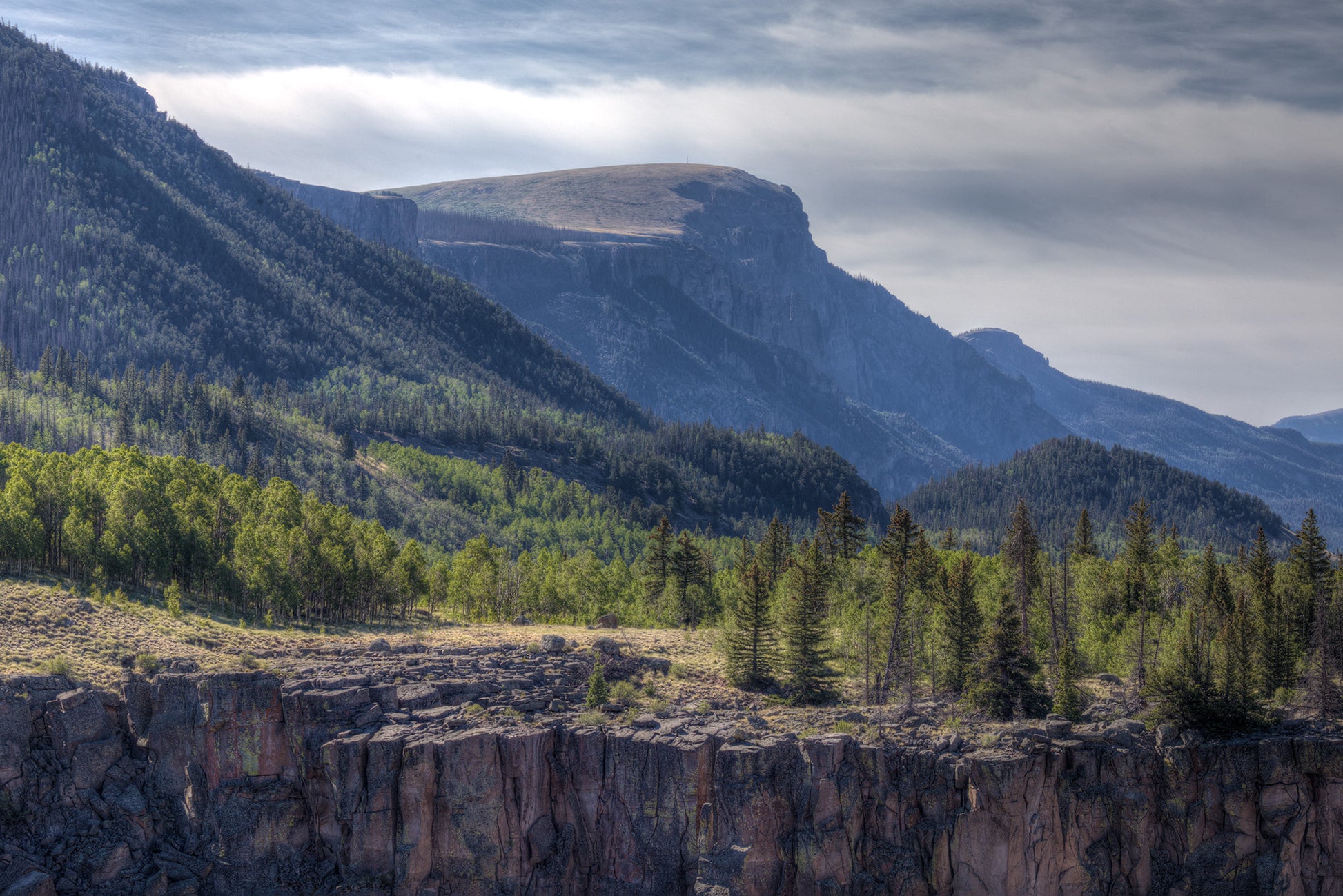 This photograph was shot the same morning we shot the “North Clear Creek Falls” image in the spring of 2022. Right before this photo was taken, Chris was watching a momma Elk in the little clearing across the canyon. She called me up to this viewpoint to see. By the time I got there, the Elk was gone but I was taken by this view. I loved the light from the early morning sun as it started to rise over the mountains to the east, with the clouds looking a bit angry above Bristol Head.