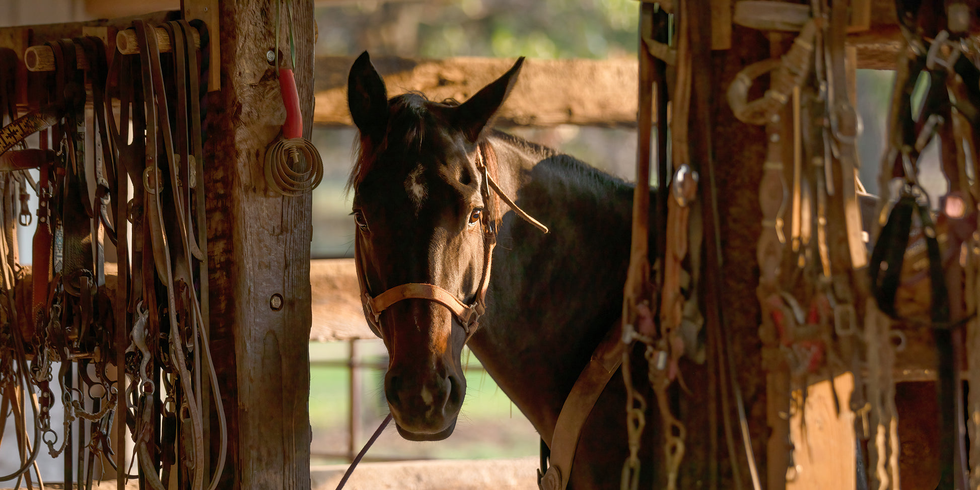 We were exploring an old horse stable in the Flint Hills of Kansas. As we waked in this fine looking fella poked his head through the opening in the stall to see who these new visitors were. I really loved how he was surrounded by all the tack hanging on both sides of the opening.
