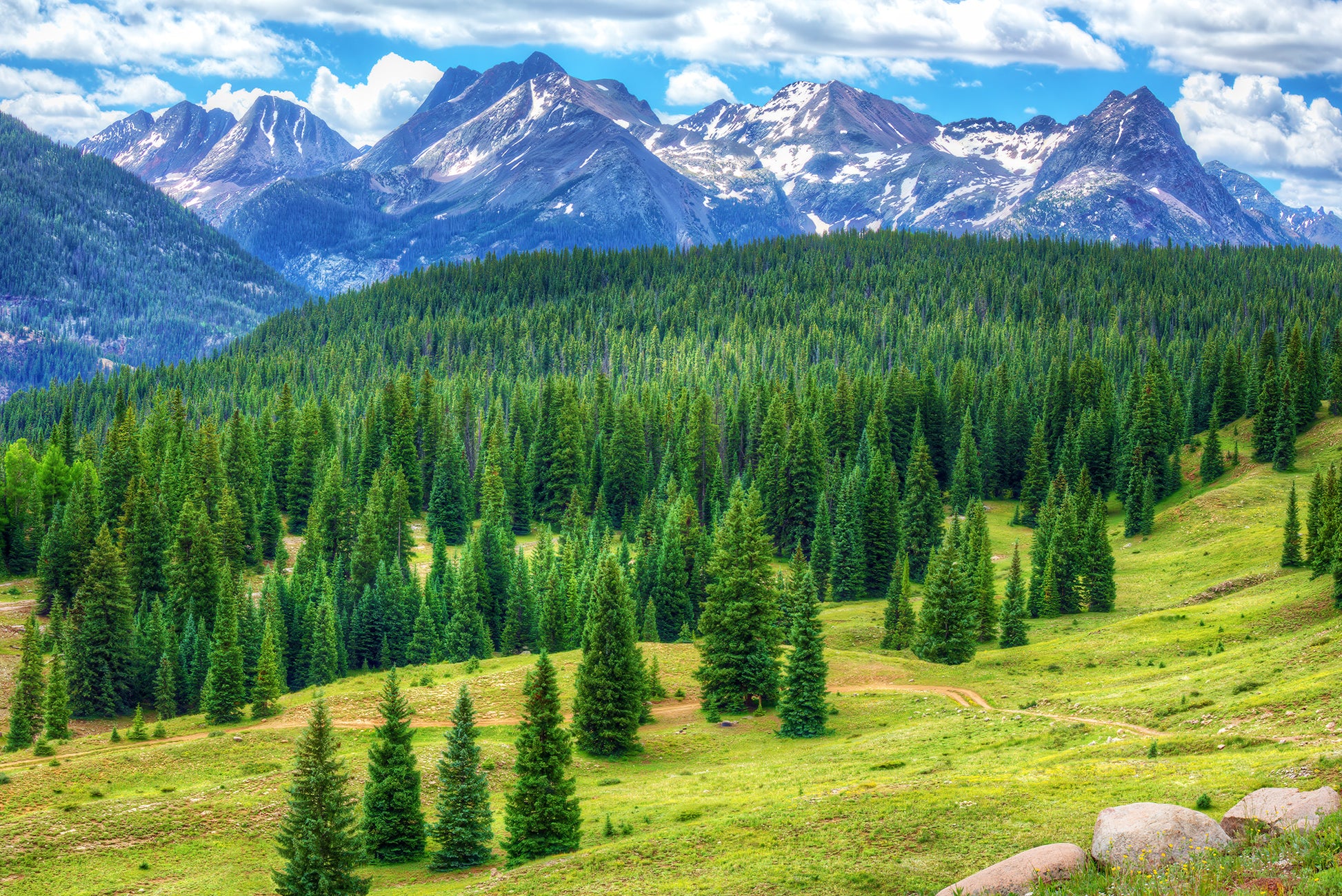 This scene was photographed along the famed Million Dollar Highway that stretches from Ouray to Durango, Colorado. Besides the striking mountain range, the Spruce trees were so beautiful in this area. Shot in early July, the snow was still on the ranges at this altitude.