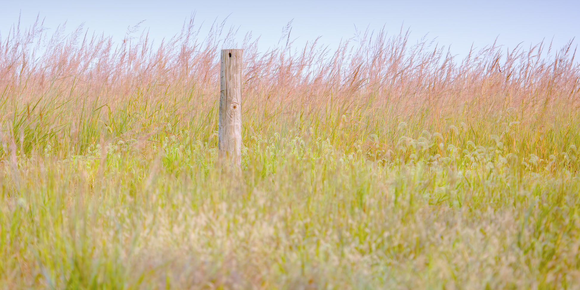 This image was shot in the late afternoon on my friend's property in rural Missouri. There is a hillside there where the grasses in the fall are really beautiful. I have photographed this hillside on many occasions, and this may be my favorite. There is an old fence line of abandoned wooden posts running along the hillside that provide a very simple and interesting point of focus. But this shot has always been about the colors of the grasses to me, and the peaceful feeling I get while there.