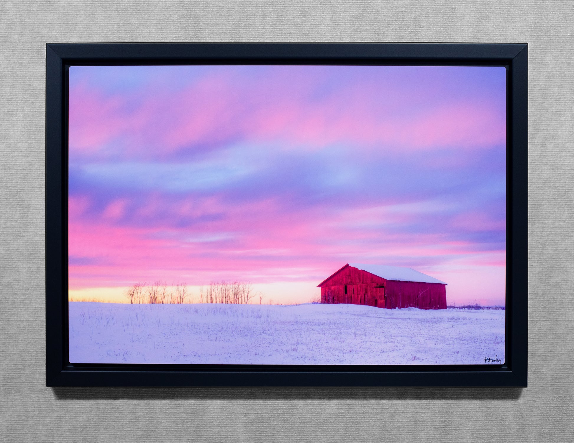 Third time was the charm. Chris and i discovered this little barn on our many trips between Lawrence, Kansas and our home in Spring Hill. It was such a cool barn and the little stand of trees added nice balance to the scene. Although it was a bit of a drive, we shot this scene three times before we shot this image. After a heavy snowfall we captured this sunset image. The subtle and beautiful colors we captured were perfect for this shot.