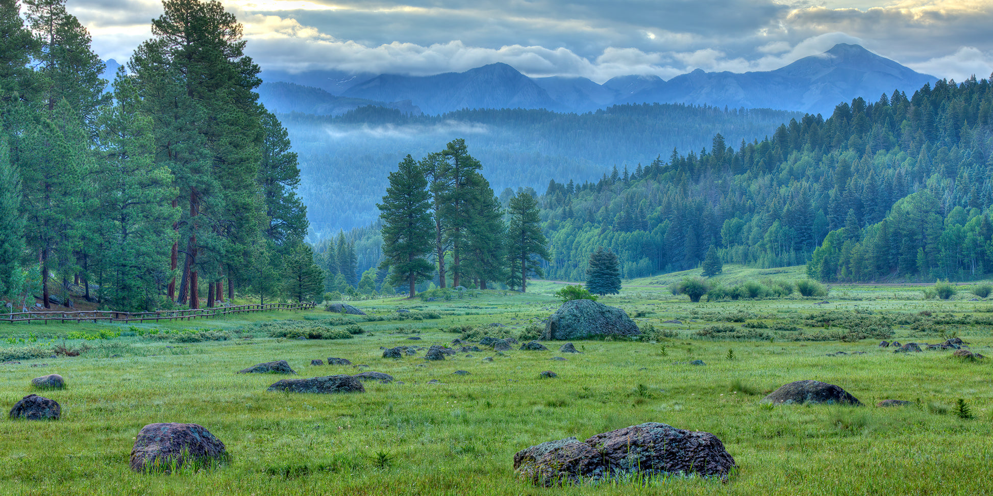 This early morning scene was captured near the Williams Creek Reservoir north of Pagosa Springs, Colorado. It had been very stormy for the days leading up this moment, and we were set up and ready to shoot as daybreak came. Although we did shoot until the sun lit up the meadow, we loved how the pre sunrise clouds were wrapping the mountains and the colors in the trees and meadow had a very dreamy feel.
