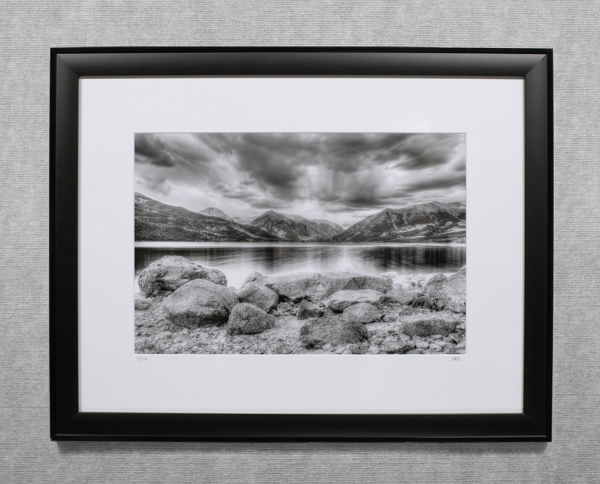 Twin Lakes Storm Black and White - 12x18 matted Lustre print in a custom built 18x24 black wood frame.
